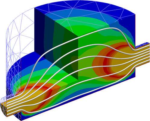The next example is still the Stokes problem, inside a 3D cylindrical tank. The picture show the norm of the fluid velocity, with some streamlines. 3D tank