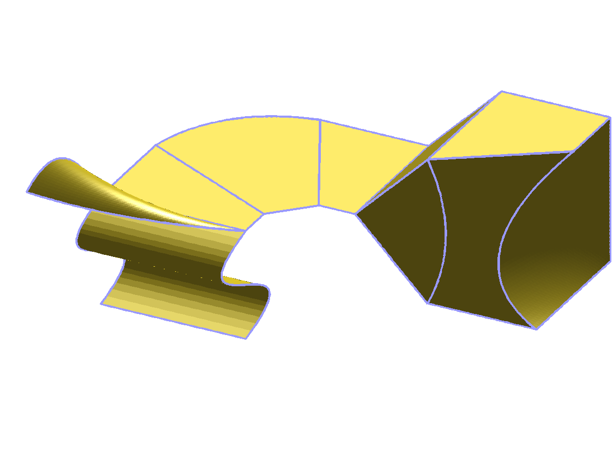 The mesh is 3D. There is a quadrangle, a curved quadrangle/triangle, a kind of curved prism and hexahedron, and a very curved (geometrical transformation of degree 3) quadrangle.