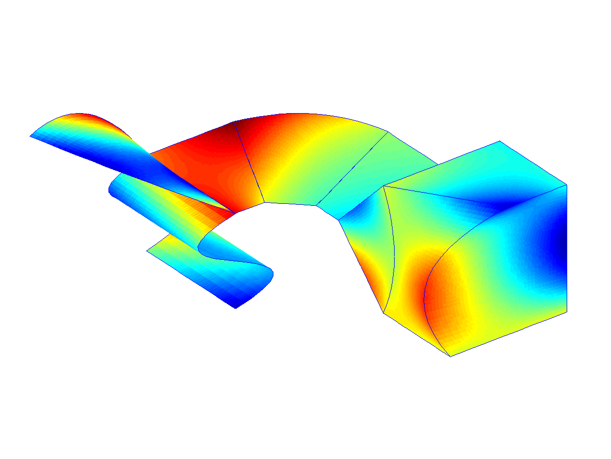 The first images illustrate the general mesh handling of getfem. The mesh description is hand-made, and involves many different element types and convex types, as you can see (the mesh, and a random function interpolated on the mesh):